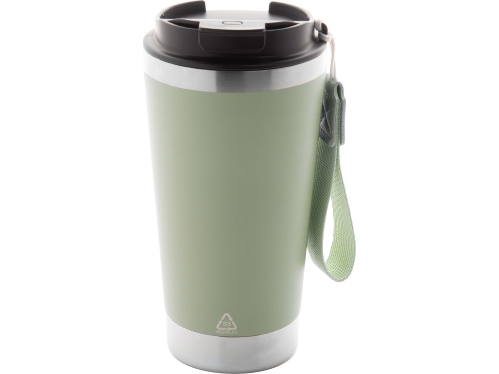 Dvoustěnný termo hrnek z recyklované nerezové oceli s víčkem na pití z PP a páskem na přenášení v odpovídající barvě. 430 ml.