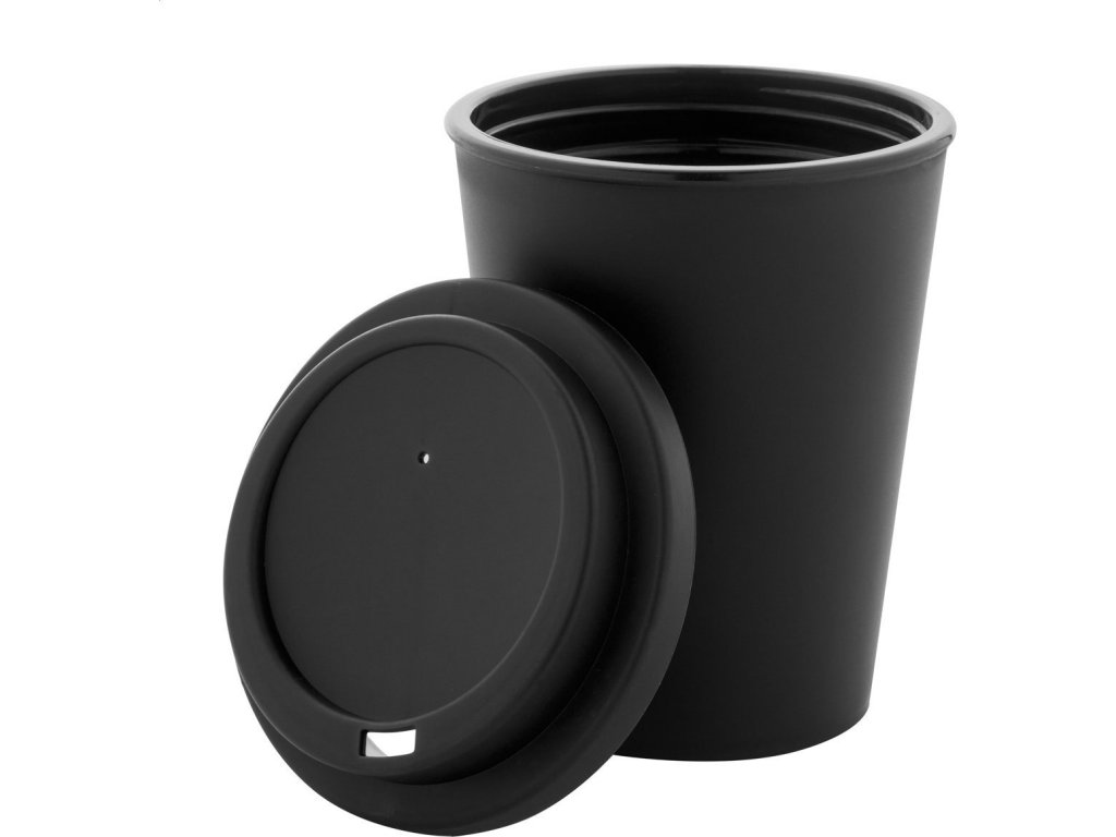 Dvoustěnný termo hrnek izolovaný PP plastem s víčkem na pití. 300 ml.