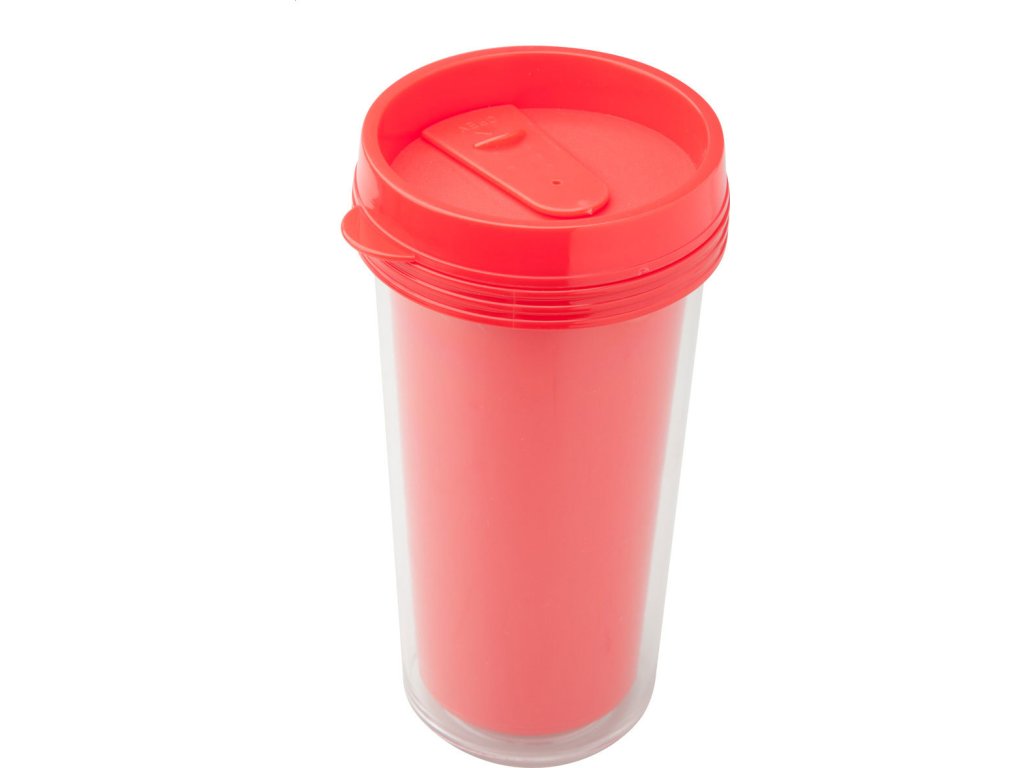 Plastový dvouvrstvý termo hrnek s otvorem na pití ve víčku. Logo lze umístit mezi stěny hrnku. Baleno v bílé papírové krabičce. Objem 450 ml.
