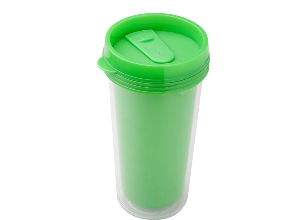 Plastový dvouvrstvý termo hrnek s otvorem na pití ve víčku. Logo lze umístit mezi stěny hrnku. Baleno v bílé papírové krabičce. Objem 450 ml.