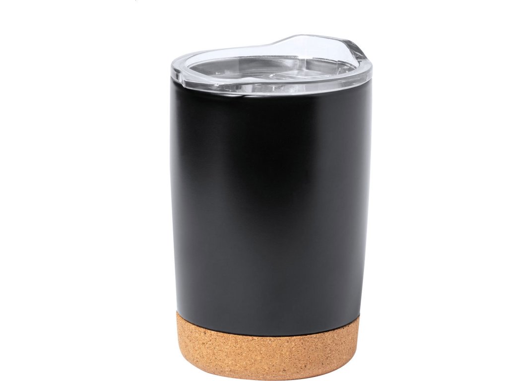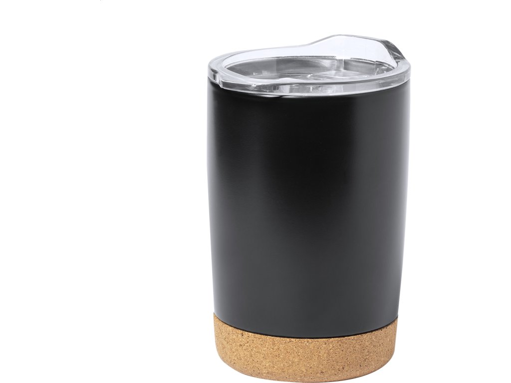 Dvoustěnný termo hrnek z nerezové oceli s průhledným víčkem na pití a korkovým dnem, 380 ml. V dárkové krabičce.
