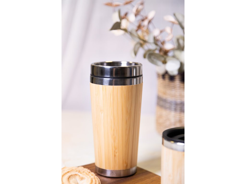 Bambusem potažený, dvoustěnný recyklovaný nerezový izolovaný termo hrnek s PP víčkem na pití, 500 ml.