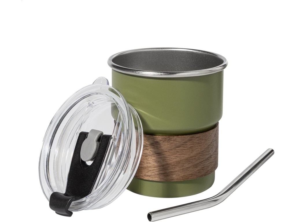 Jednostěnný cestovní hrnek z recyklované nerezové oceli s úchopem z ořechového dřeva, plastovým víčkem a brčkem z recyklované nerezové oceli. 260 ml.