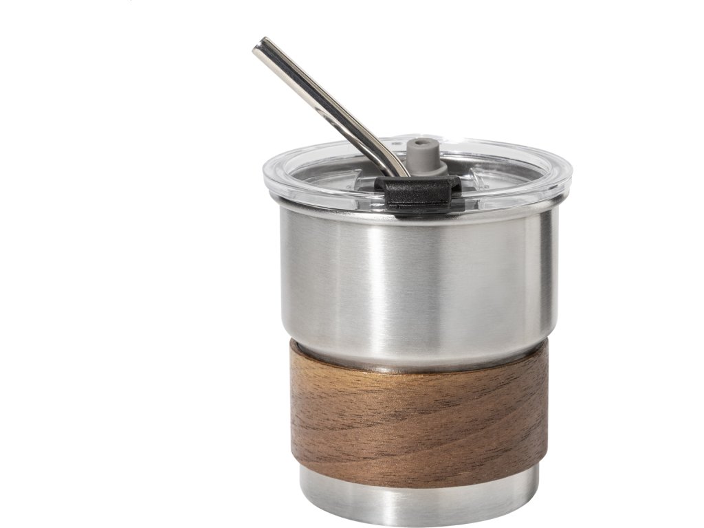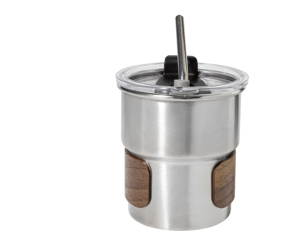Jednostěnný cestovní hrnek z recyklované nerezové oceli s úchopem z ořechového dřeva, plastovým víčkem a brčkem z recyklované nerezové oceli. 260 ml.