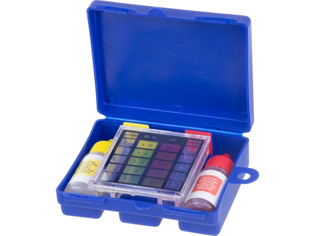 Komorový tester pro měření pH a chlóru. Balení obsahuje tester a 2 tekuté dávkovače pro měření.
