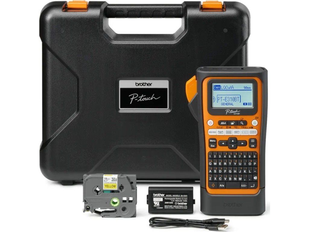 Obsah balení: Tiskárna štítků PT-E310BT, Li-Ion dobíjecí akumulátor, USB kabel type C (1m, černý), 1x 18 mm extrémně přilnavá páska s černým tiskem na žlutém podkladu, dokumentace, pouzdro