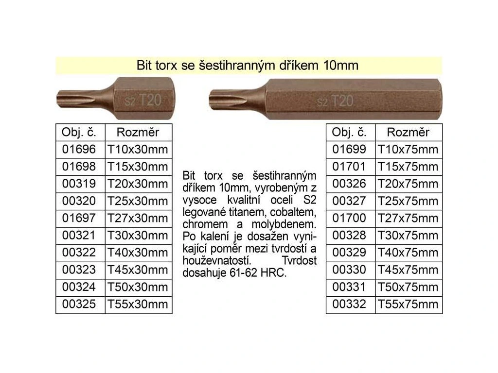 Bit torx se šestihranným dříkem 10mm, vyrobeným z vysoce kvalitní oceli S2 legované titanem, cobaltem, chromem a molybdenem. Po kalení je dosažen vynikající poměr mezi tvrdostí a houževnatostí. Tvrdost dosahuje 61-62 HRC.