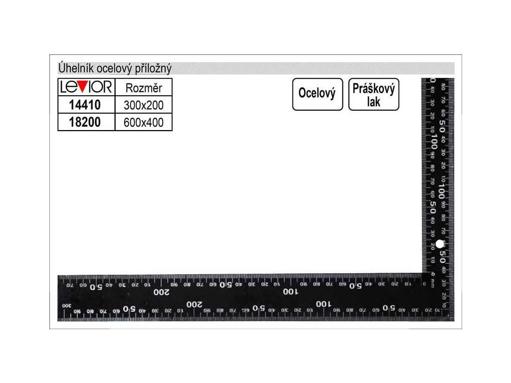 Truhlářský úhelník, vyrobený z tlustého plechu, natřený černě, s jasnou bílou milimetrovou stupnicí na jedné straně a palcovou stupnicí na druhé straně.