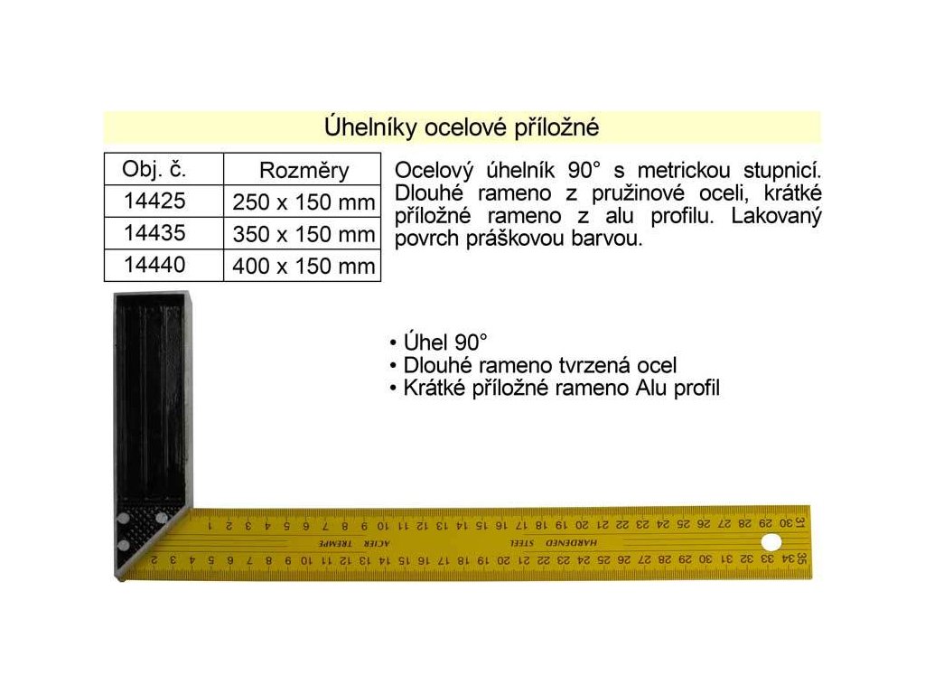 Ocelový úhelník 90° s metrickou stupnicí. Dlouhé rameno délka 250 mm z pružinové oceli, krátké příložné rameno délka 100 mm z alu profilu. Lakovaný povrch práškovou barvou.