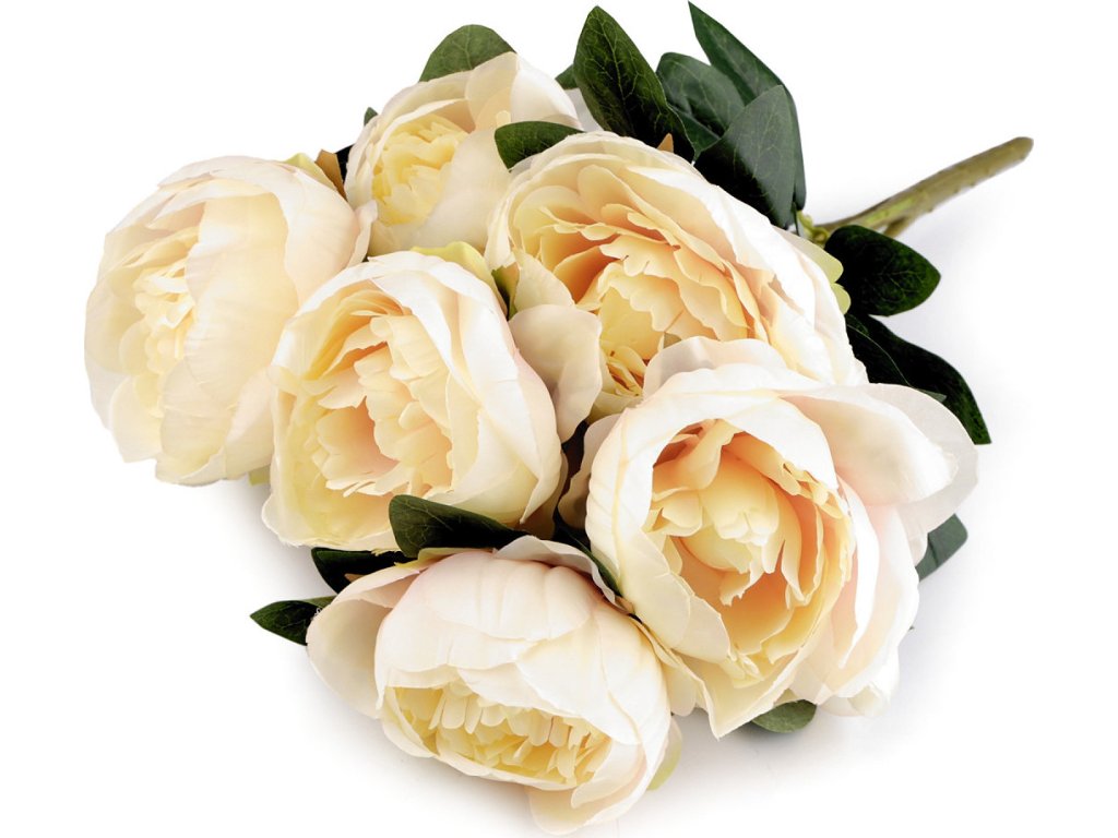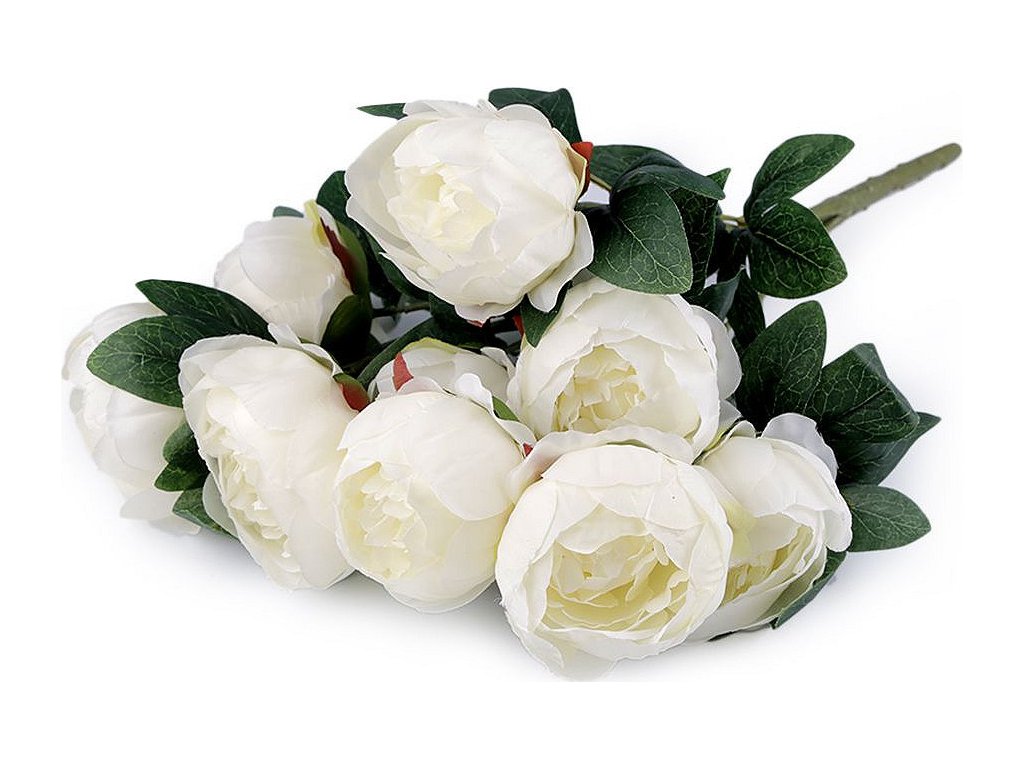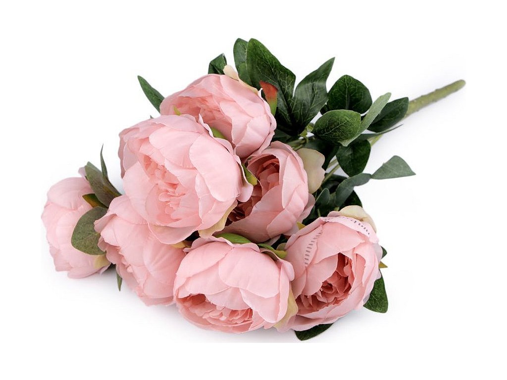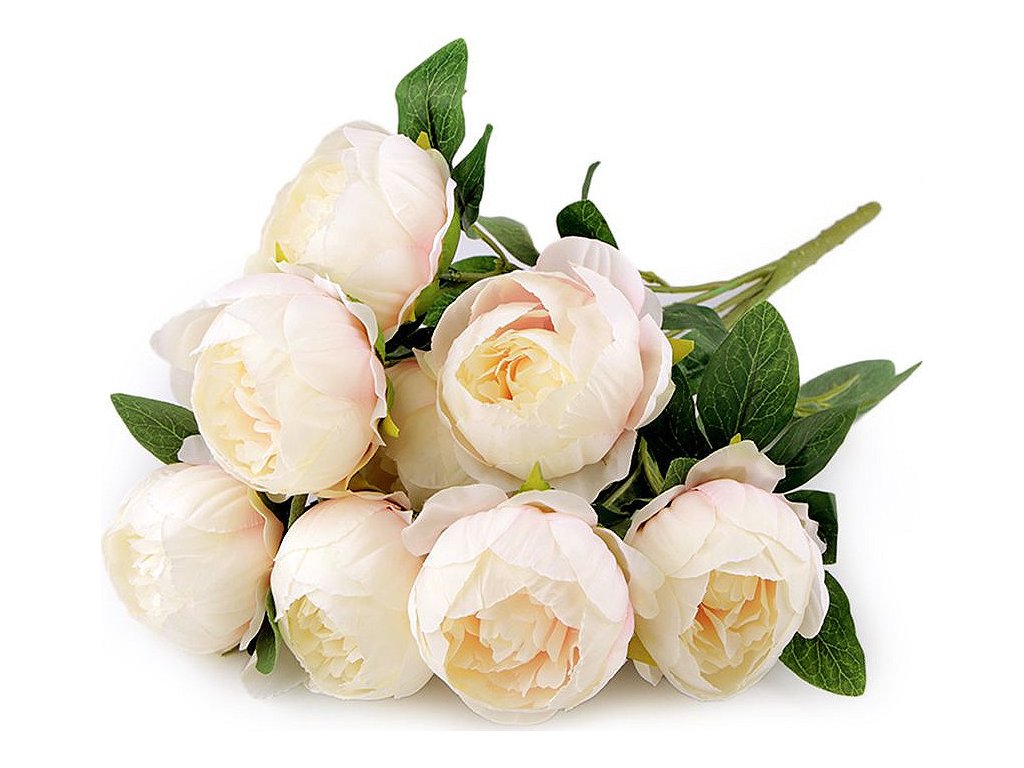 Velká kytice umělých pivoněk vypadá jako živá. Květy a lístky jsou textilní. V jednom svazku je 9 květů, které jsou na ohebném drátku. Použití: Kytice pivoněk vynikne ve váze i na věncích. Jednotlivé květy můžete zakomponovat do věnečků a ozdob do vlasů.