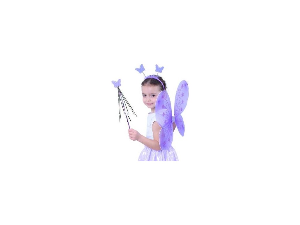 Roztomilá fialová motýlí křidélka na gumičku jsou určena pro holčičky ve věkovém rozmezí 3-10 let (104-150 cm). Součástí této karnevalové sady je také čelenka s motýlky na pružinkách a hůlka.
