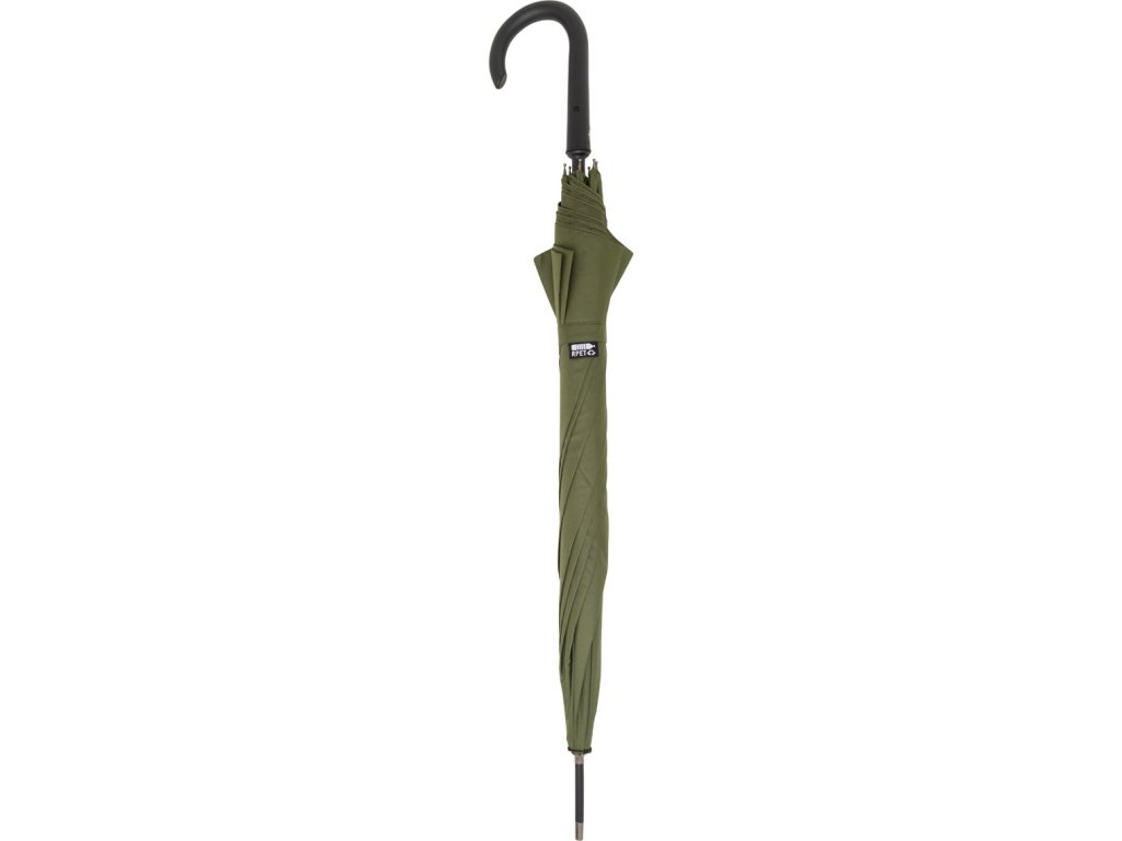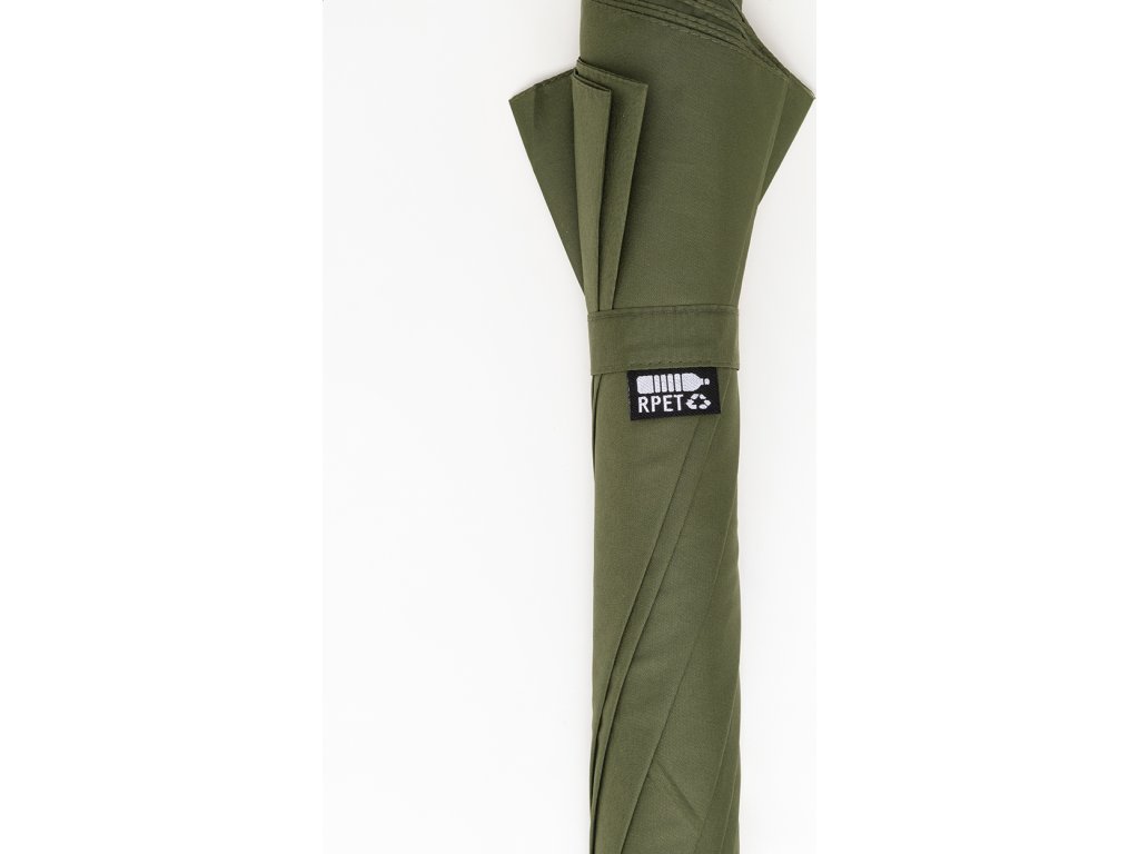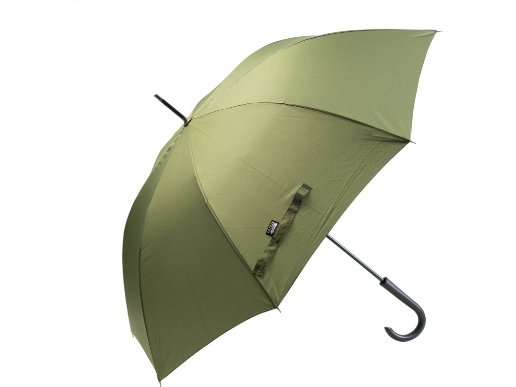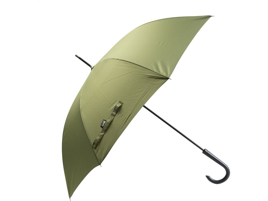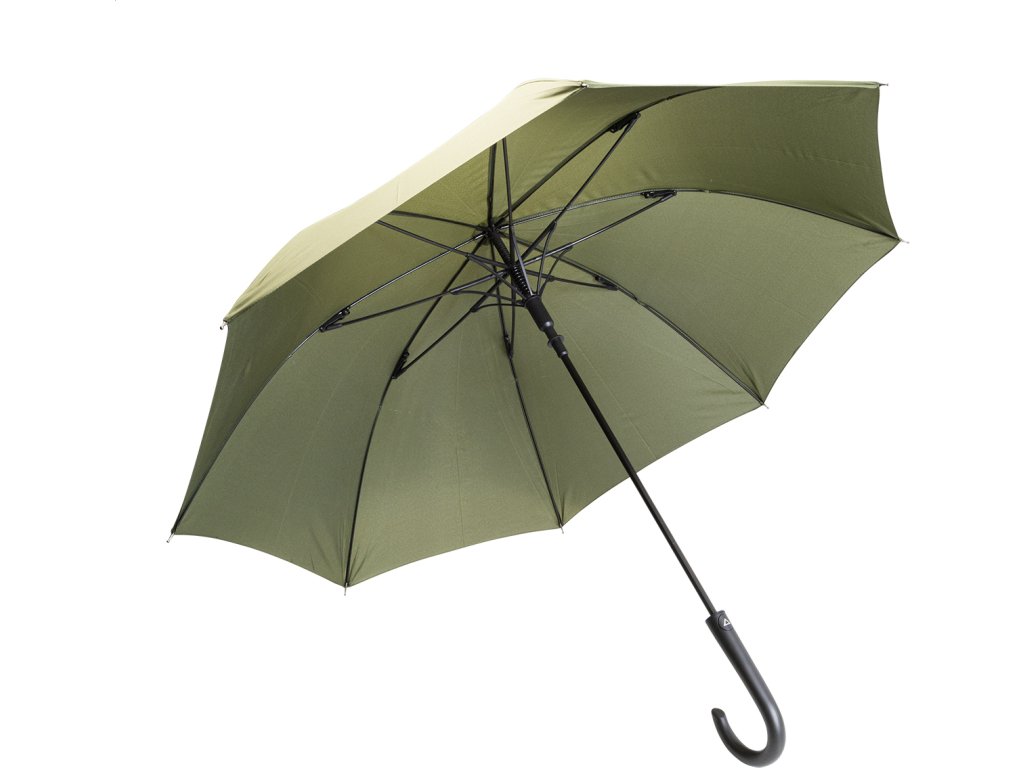 Automatický větruodolný deštník s 8 panely, sklolaminátovým rámem, kovovou tyčí a zakřivenou ABS rukojetí. Pongee 190T RPET. S výrazným štítkem RPET.