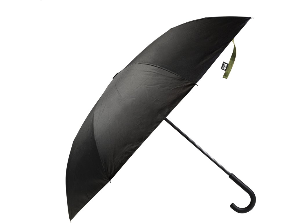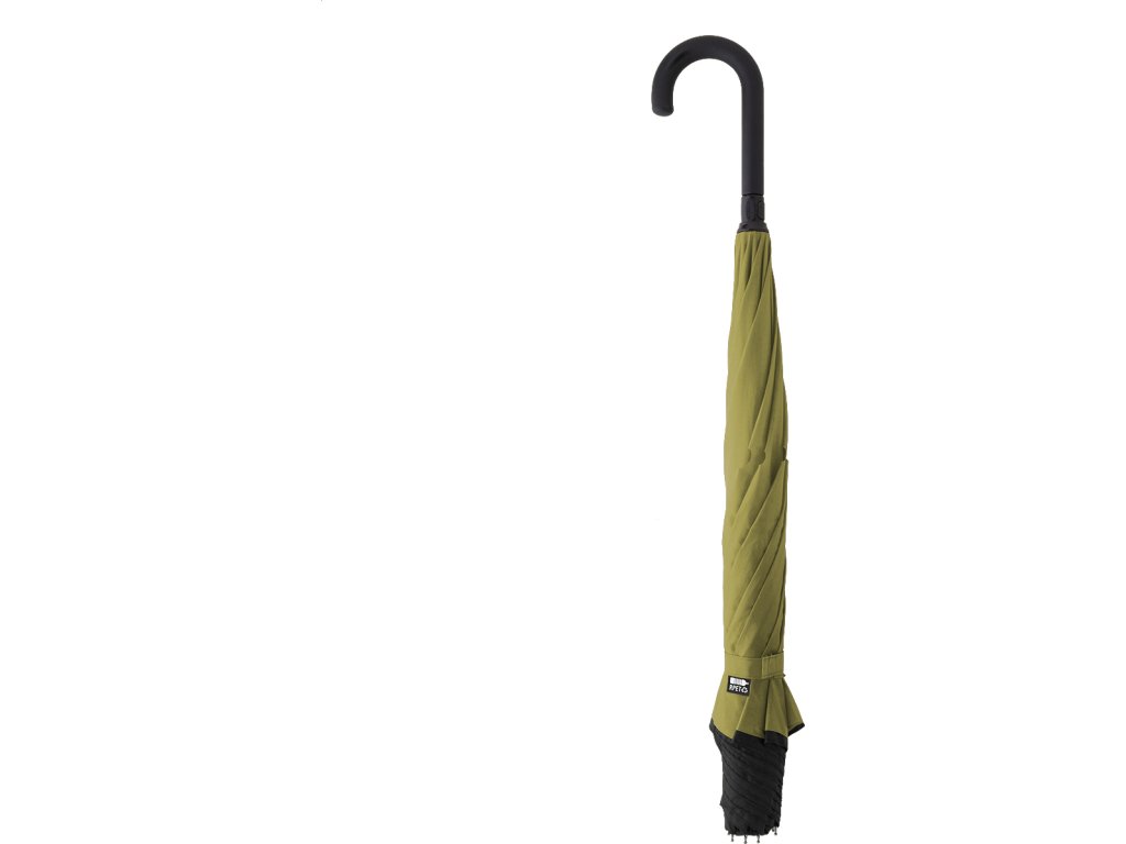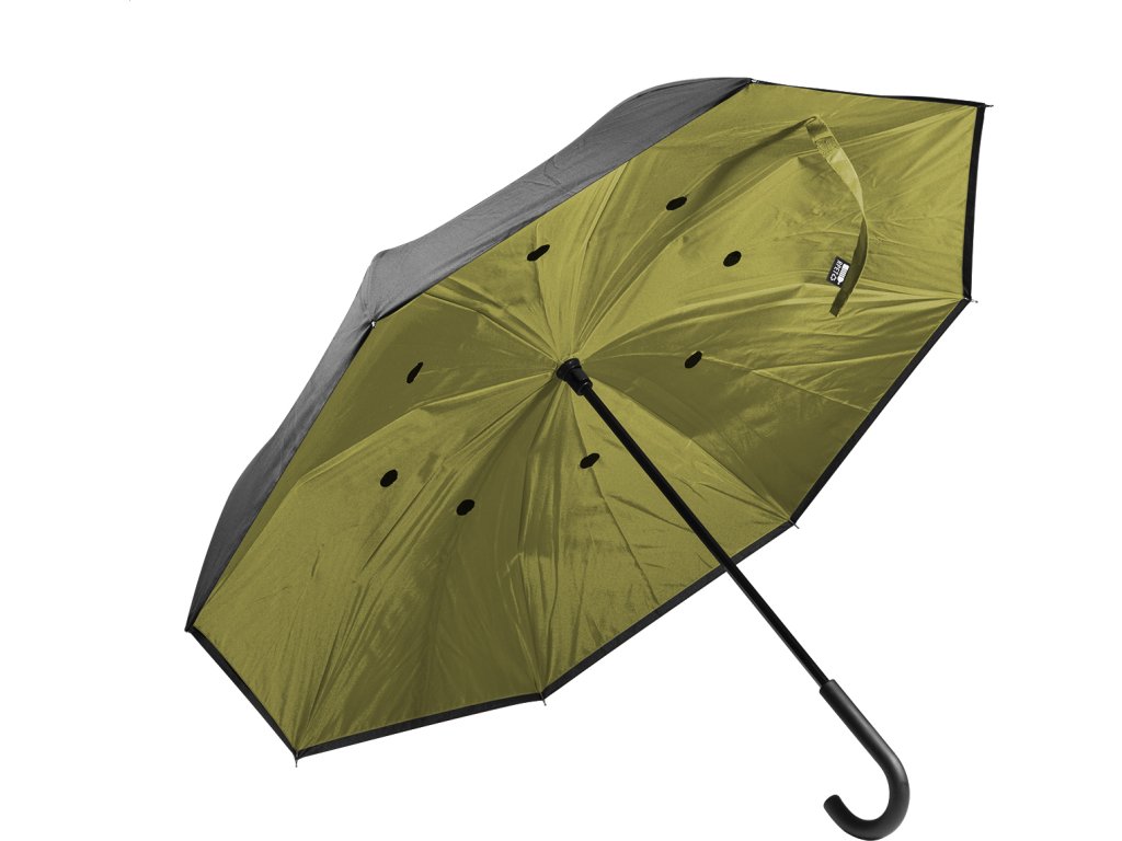 Manuální větruodolný deštník s reverzním otevíráním, 8 panely, dvouvrstvou dvoubarevnou stříškou, kovovým rámem, žebry ze skelných vláken a pogumovanou rukojetí. Materiál: 190T RPET pongee. S výrazným štítkem RPET.