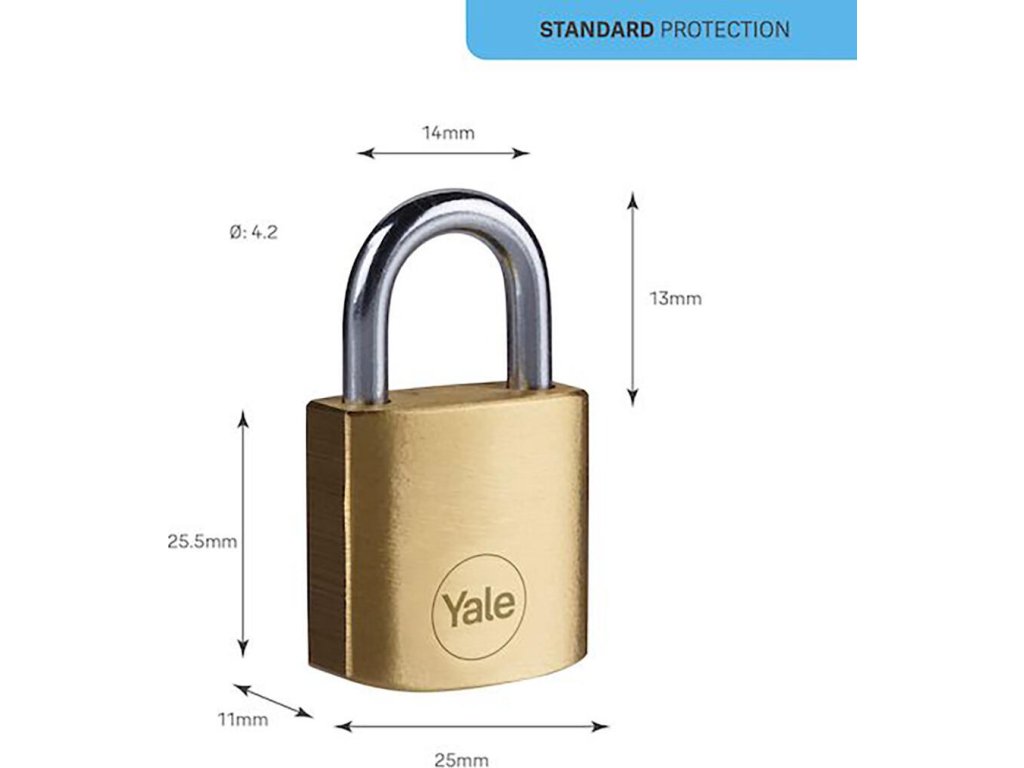 Visiaci mosadzný zámok Yale so šírkou 25 mm so štandardným stupňom zabezpečenia. Testovaný na odolnosť proti korózii až 96 hodín, aby poskytovali ochranu proti rôznym poveternostným podmienkam. Balenie obsahuje 3 kľúče.