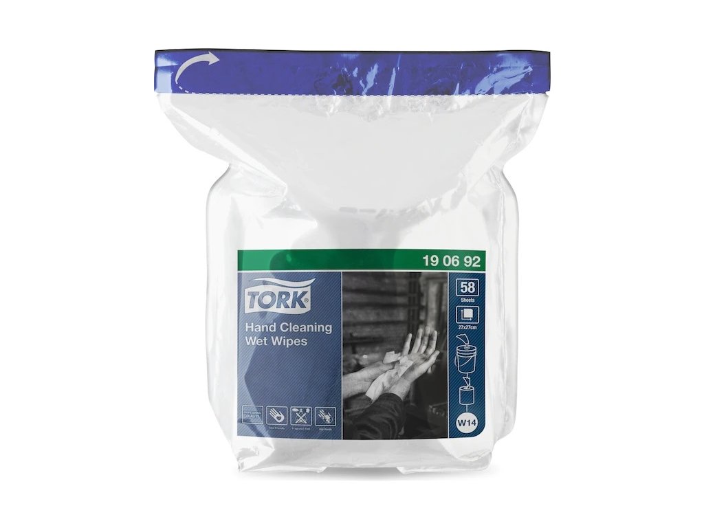 Náhradní balení vlhčených utěrek TORK Premium z netkané textilie napuštěná emulzí na čištění rukou, 58 útržků, 27x27cm, 65g/m2, mobilní řešení určené k čištění všude tam, kde není k dispozici voda