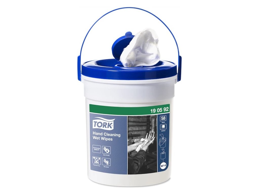 vlhčená utěrka Tork z netkané textilie napuštěná emulzí je účinným řešením pro čištění rukou, když není po ruce voda, 58 útržků, 27x27cm, 65g/m2