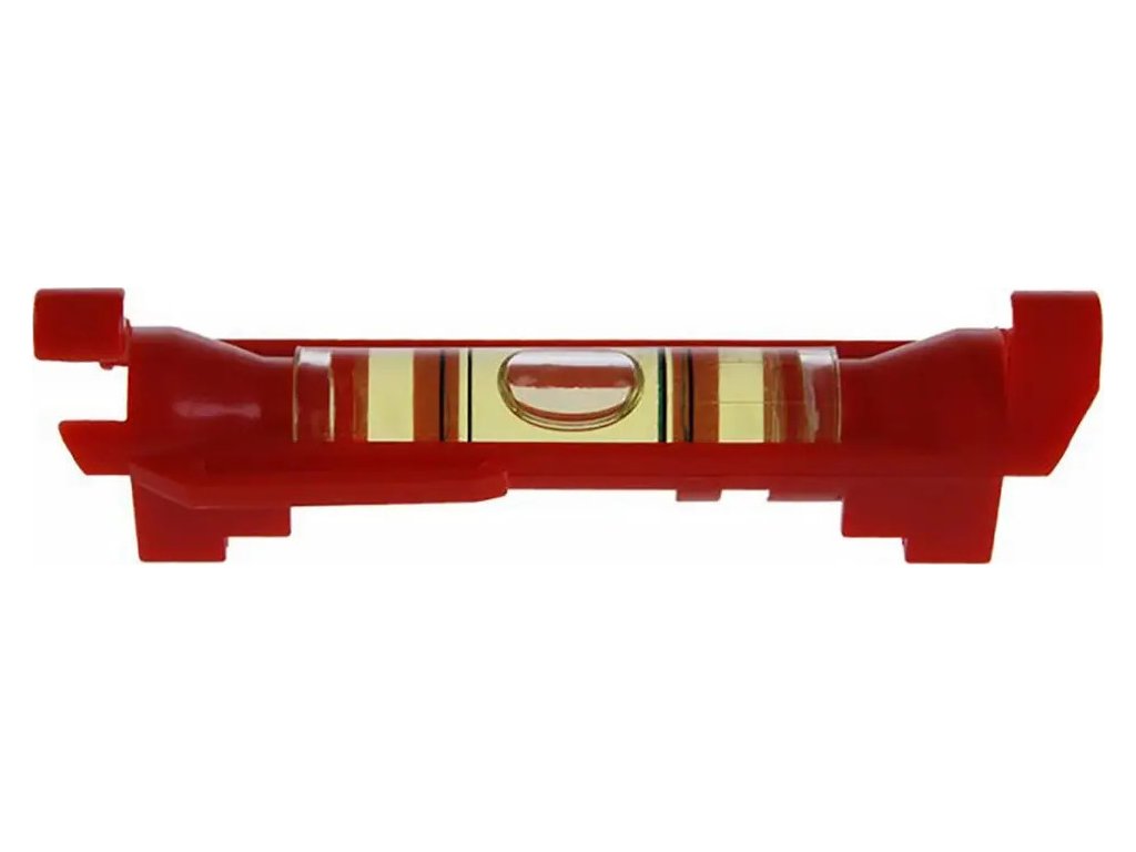 Malá plastová vodováha se dvěma háčky pro zavěšení na provázek, zvlášť lehké provedení, aby se zabránilo prověšení. Spona na opasek, pro kapsu. V-drážka pro měření horizontální polohy kulatých trubek.