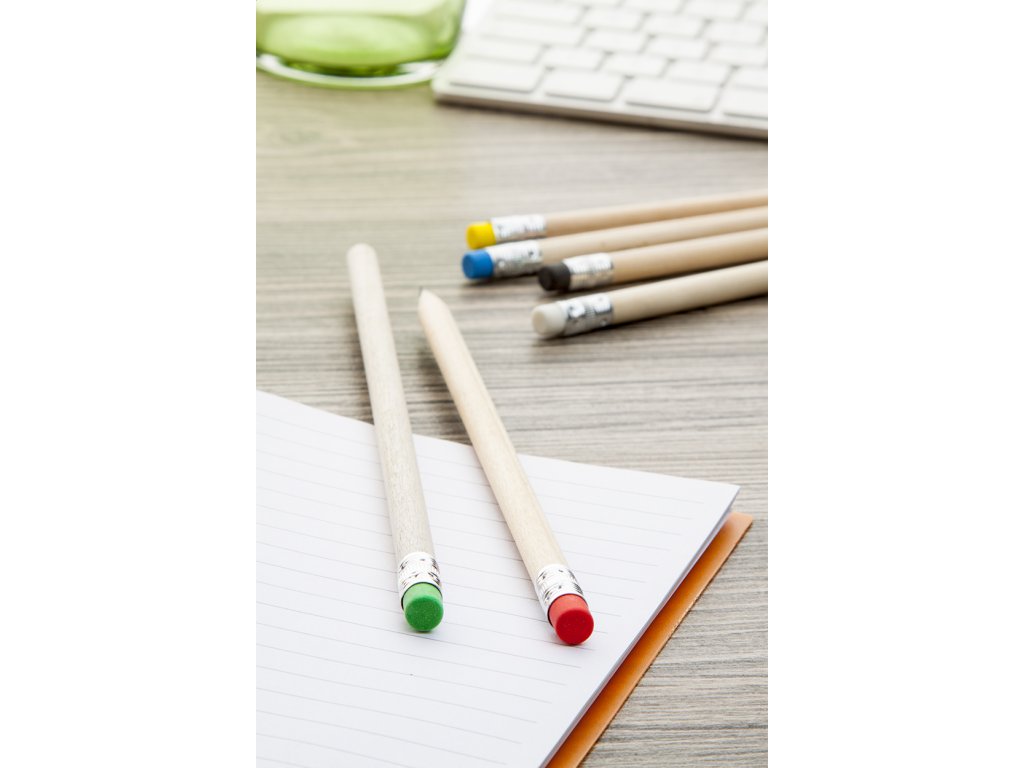 Tužka z přírodního dřeva s barevnou gumou. Dodává se neořezaná.