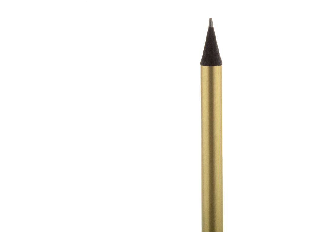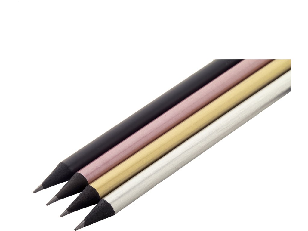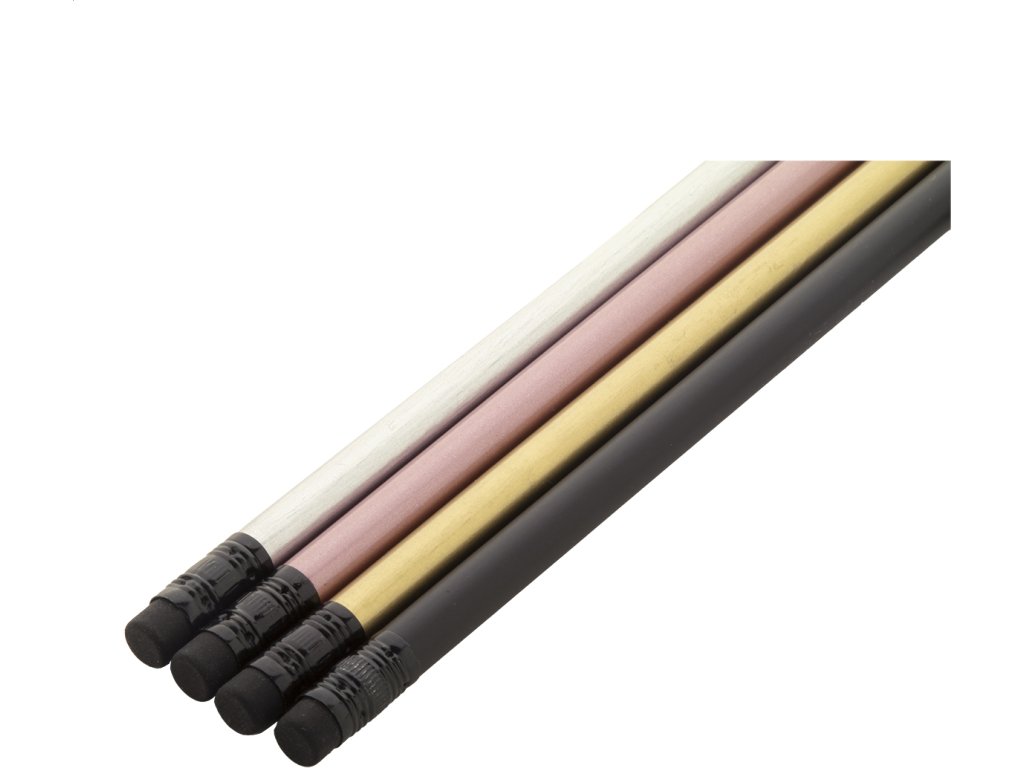 Černá dřevěná tužka v metalickém provedení, s černou gumou. Ořezaná, třída HB.
