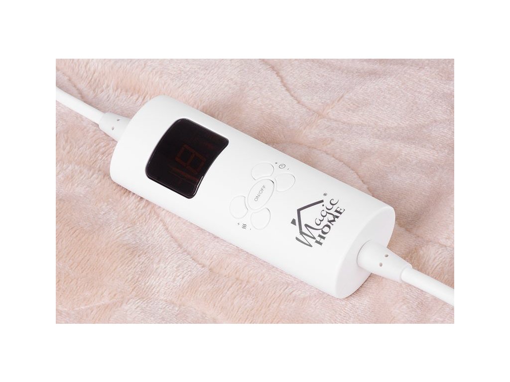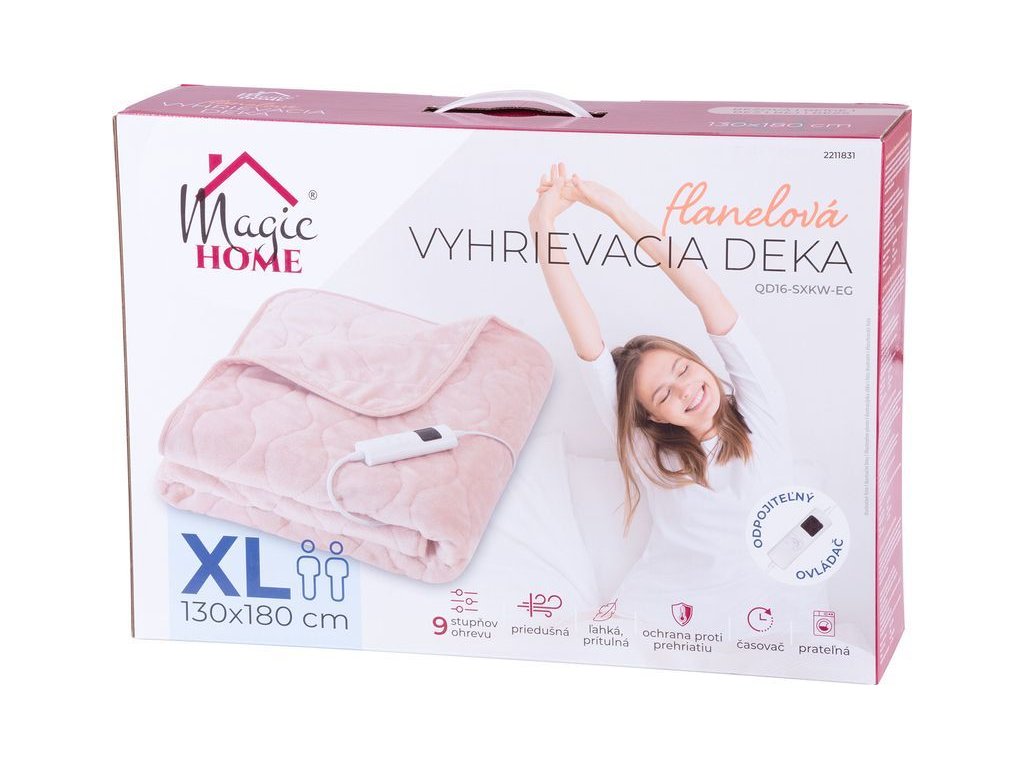Elektrická flanelová vyhřívací deka MagicHome zpříjemní Vaše chvíle relaxu a nabízí Vám potěšení z přizpůsobeného tepla, které Vás zahalí do příjemného objetí kdykoli si budete přát. Deka je vyrobena z měkké flanelové látky, která je lehká - 1,3 kg. Je zároveň prodyšná, příjemná na dotek a zároveň dostatečně teplá pro udržení tělesné teploty. Doporučuje se při léčbě revmatických onemocnění a artritidy. Uvolňuje svaly a zlepšuje cirkulaci krve. Ovládání teploty pomocí ovladače na napájecím kabelu ( 9 stupňů ohřevu: 25°C - 55°C). Díky odpojitelnému ovladači lze deku prát v pračce. Disponuje časovačem s Max. 9 hodinovým režimem ON. Barva: béžová. Rozměr y: 130x180 cm, je vhodná pro 2 osoby.
