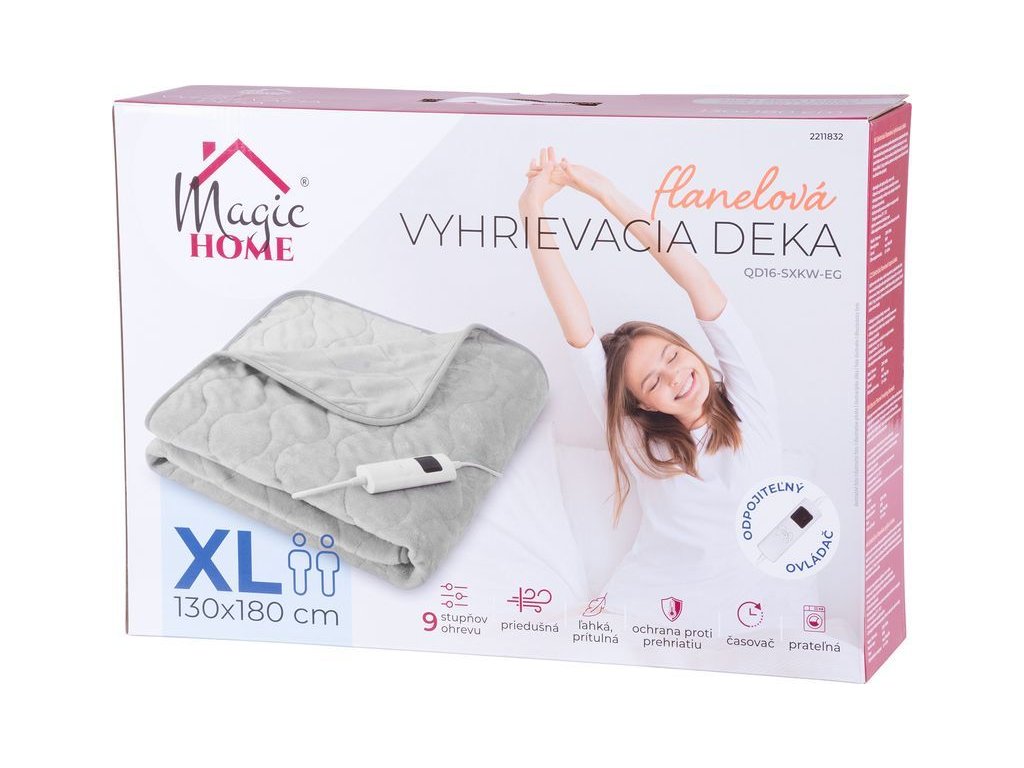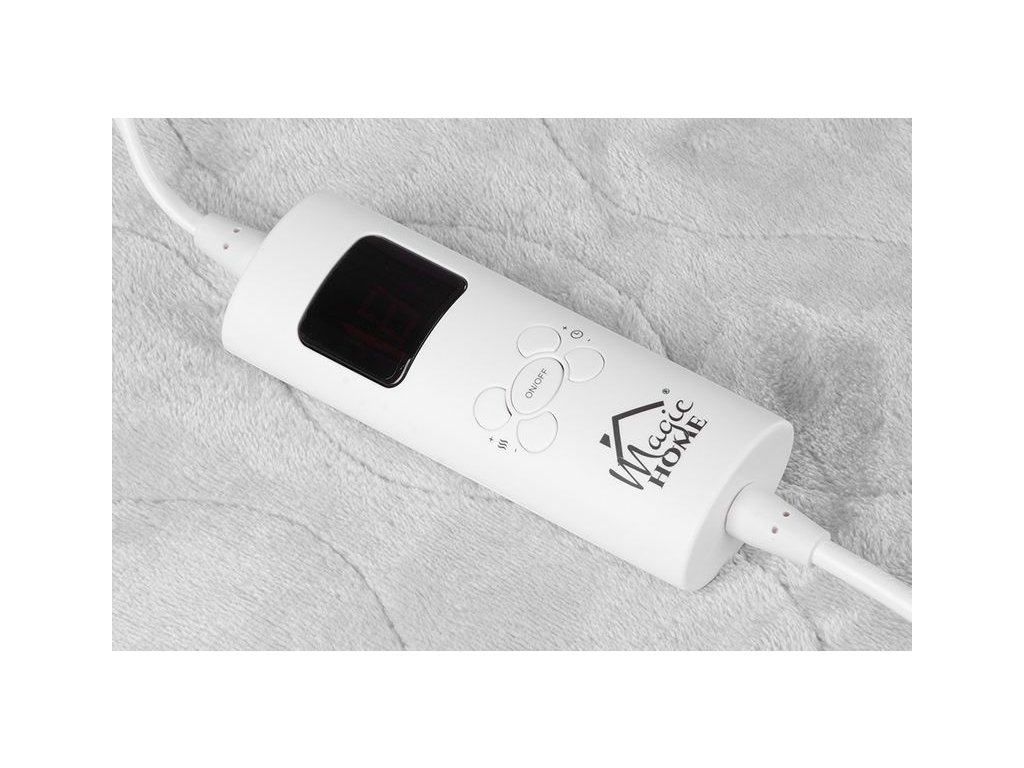 Elektrická flanelová vyhřívací deka MagicHome zpříjemní Vaše chvíle relaxu a nabízí Vám potěšení z přizpůsobeného tepla, které Vás zahalí do příjemného objetí kdykoli si budete přát. Deka je vyrobena z měkké flanelové látky, která je lehká - 1,3 kg. Je zároveň prodyšná, příjemná na dotek a zároveň dostatečně teplá pro udržení tělesné teploty. Doporučuje se při léčbě revmatických onemocnění a artritidy. Uvolňuje svaly a zlepšuje cirkulaci krve. Ovládání teploty pomocí ovladače na napájecím kabelu ( 9 stupňů ohřevu: 25°C - 55°C). Díky odpojitelnému ovladači lze deku prát v pračce. Disponuje časovačem s Max. 9 hodinovým režimem ON. Barva: šedá. Rozměry: 130x18 0 cm, je vhodná pro 2 osoby.
