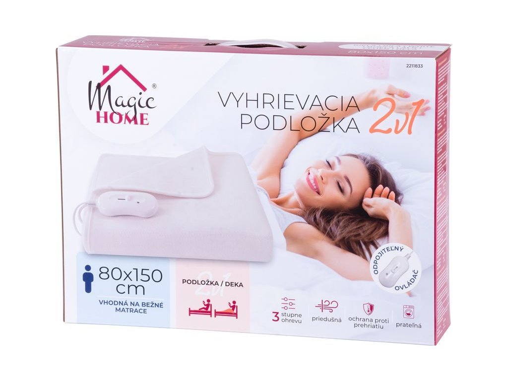 Vyhřívací podložka 2v1 MagicHome zpříjemní Vaše chvíle relaxu a nabízí Vám potěšení z přizpůsobeného tepla, které Vás zahalí do příjemného objetí kdykoli si budete přát. Podložka je vyrobena z měkké netkané textilie, která je lehká, prodyšná, příjemná na dotek a zároveň dostatečně teplá pro udržení tělesné teploty. Využití 2v1: jako podložka i jako deka. Doporučuje se při léčbě revmatických onemocnění a artritidy. Uvolňuje svaly a zlepšuje cirkulaci krve. Ovládání teploty pomocí ovladače na napájecím kabelu (3 stupně ohřevu: 25°C - 50°C). Díky odpojitelnému ovladači lze podložku prát v pračce. Barva: bílá. Rozměry: 80x150 cm, je vhodná pro běžné matrace.