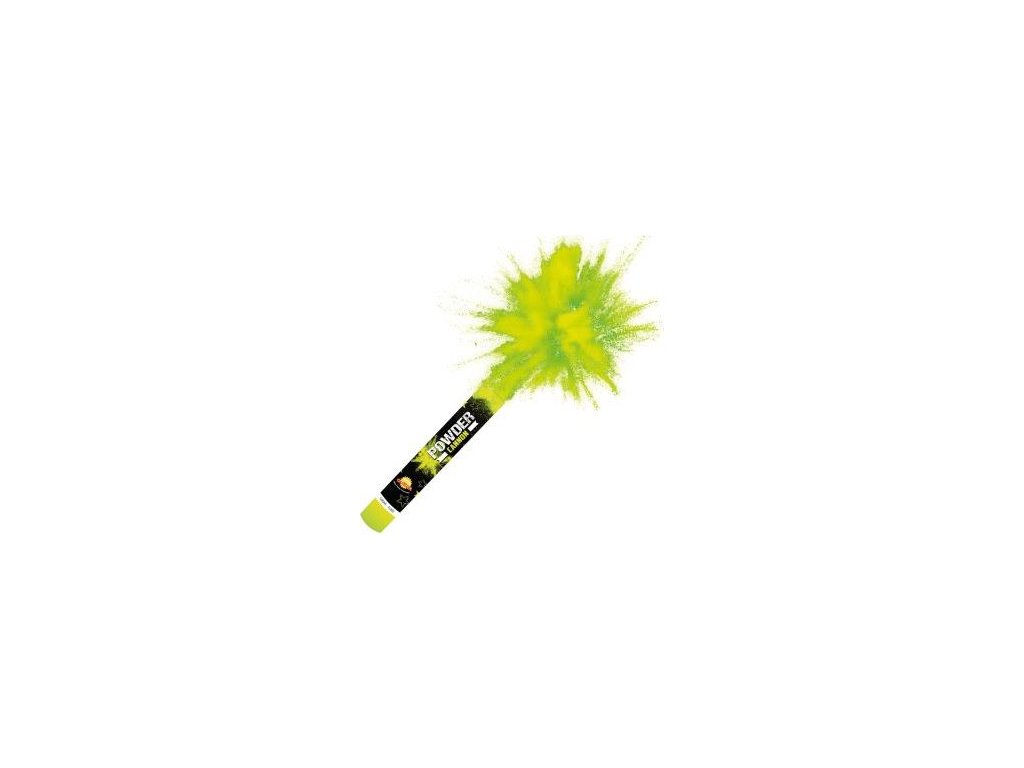Efektní ruční vrhač žlutého prášku. Tubus pracuje na podobném principu jako jsou vystřelované konfety.
