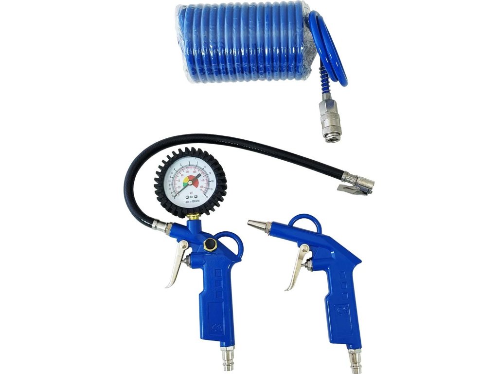 Sada ke kompresoru s obsahem: ofukovací pistole, pistole s manometrem na foukání pneumatik a spirálové přívodní hadice délky 4m.