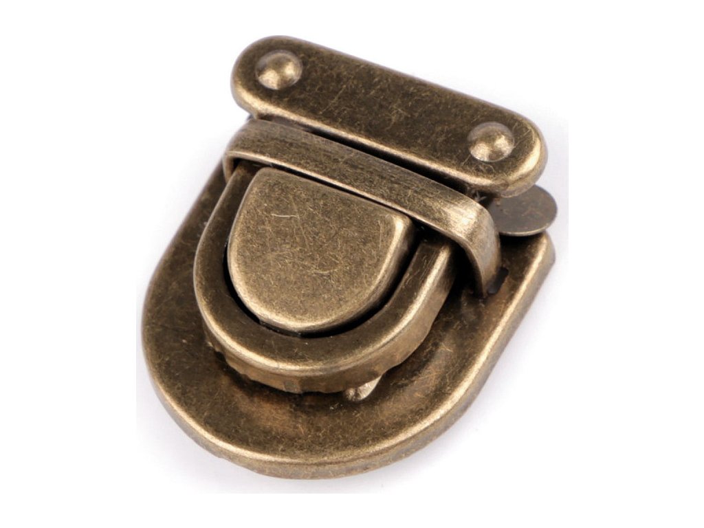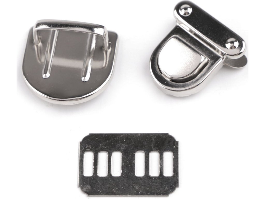 Kovové zapínání na tašku či kabelku se skládá ze tří dílů. Plíšek se připevní na vnitřní část tašky, díl s nožkami na vnější část (nožky se zaháknou do plíšku a roztáhnou) a třetí díl se zoubky na její chlopeň. Díl na chlopeň se upevní tak, že rozevřete čelisti, na kterých jsou zoubky a mezi ně vložíte materiál, na který chcete zapínání upevnit. Následně čelisti sevřete, zoubky tak zamezí pohybu látky. Rozměry: - plíšek: 19 x 27 mm - díl s nožkami: 26 x 27 mm - díl na chlopeň: 25 x 25 mm Celkové rozměry po zapnutí jsou 26 x 29 mm.
