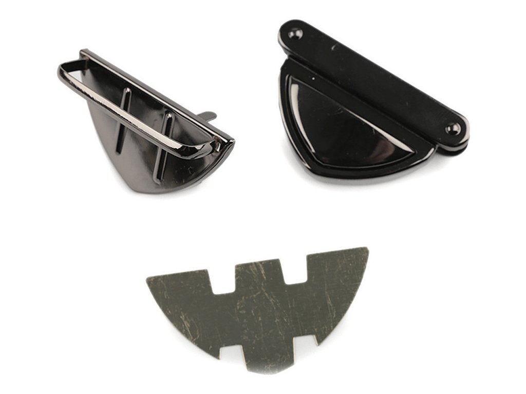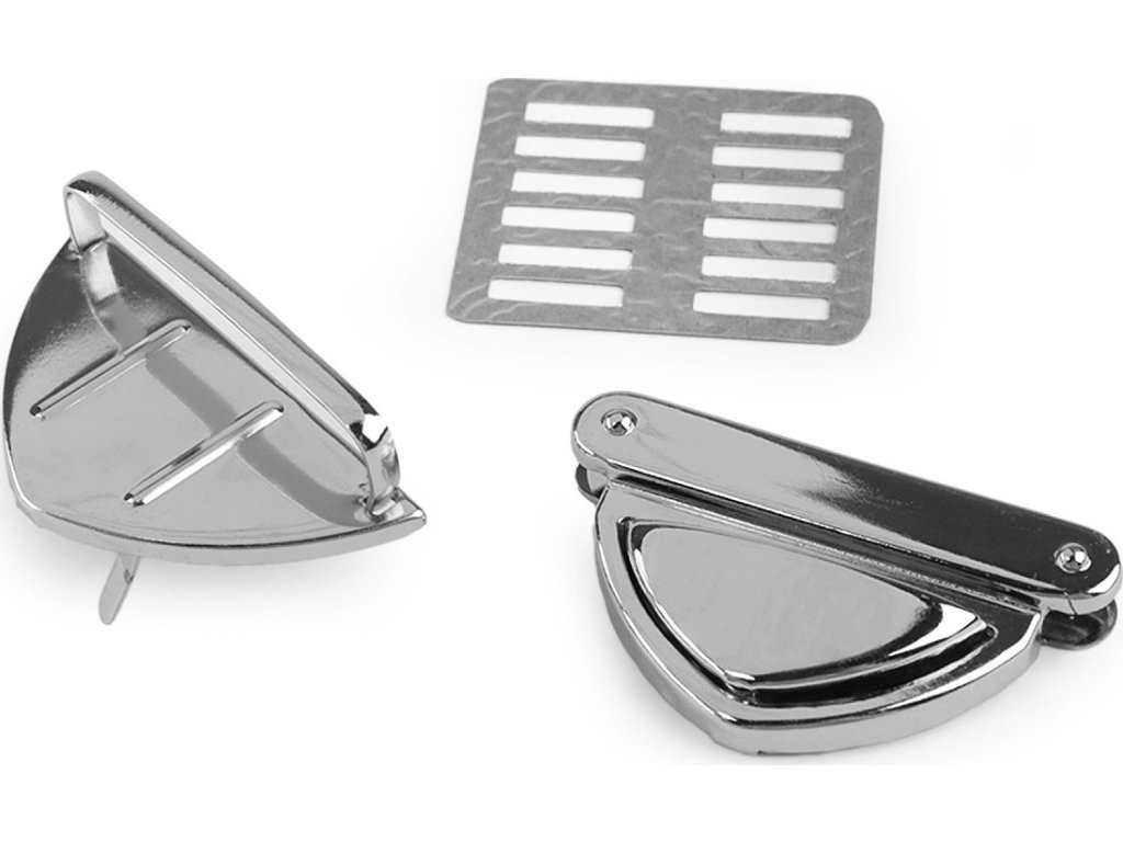 Klasické kovové zapínání využijete na tašku či kabelku. Skládá se ze tří dílů. Díl s nožičkami se připevní na vnější část. Nožky se zaháknou do druhého dílu, do plíšku, a roztáhnou. Třetí díl se zoubky se připevní na chlopeň tašky. Ten se upevní tak, že rozevřete čelisti, na kterých jsou zoubky, a mezi ně vložíte materiál, na který chcete zapínání upevnit. Následně čelisti sevřete, zoubky tak zamezí pohybu látky. Pak už jen stačí zasunout díly do sebe tak, až uslyšíte cvaknutí. Potom je teprve taška bezpečně uzavřena. Rozměry: - plíšek: 34 x 40 mm - díl s nožkami: 25 x 50 mm - díl na chlopeň: 30 x 52 mm Celkové rozměry po zapnutí jsou 52 x 35 mm.