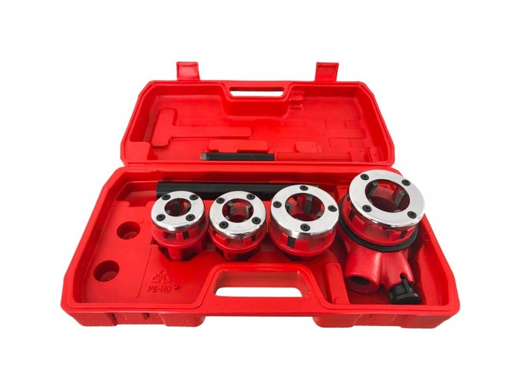 Sada obsahuje 4 litinové závitníky s 4 noži z nástrojové oceli, račnovou hlavu a dvojdílnou rukojeť.