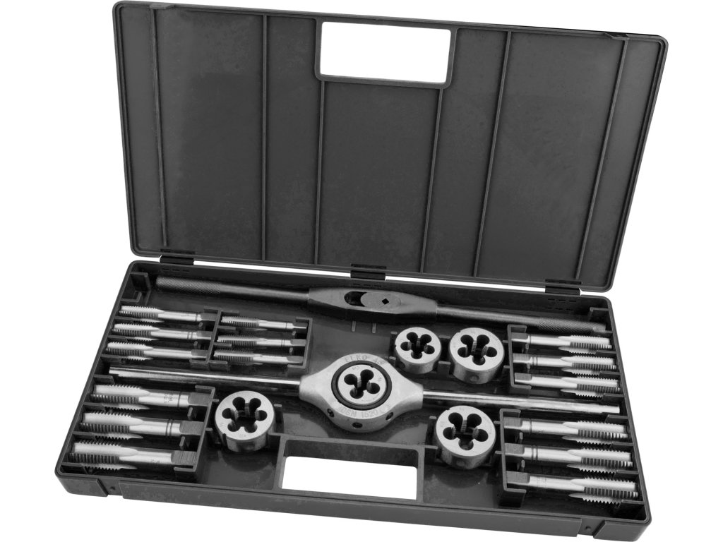• tříčlenná sada závitníků se závitovými očky z kvalitní nástrojové oceli se základním stoupáním v plastové kazetě
