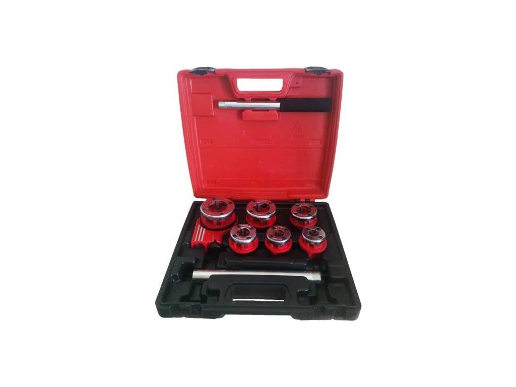 Závitníky v palcové soustavě určené na řezání závitů na potrubí. Sada obsahuje 6 litinových závitníků s 4 noži z nástrojové oceli, ráčnovou hlavu a dvojdílnou rukojeť. Vše uloženo v plastovém kufříku.